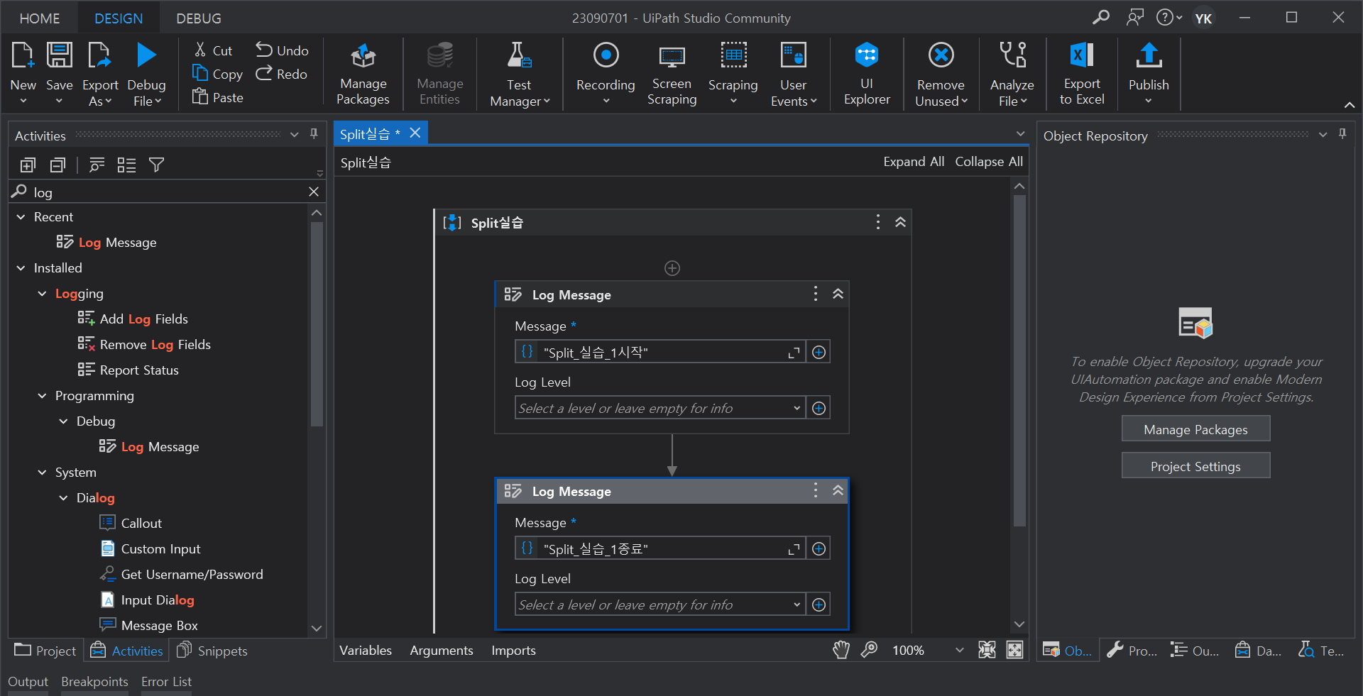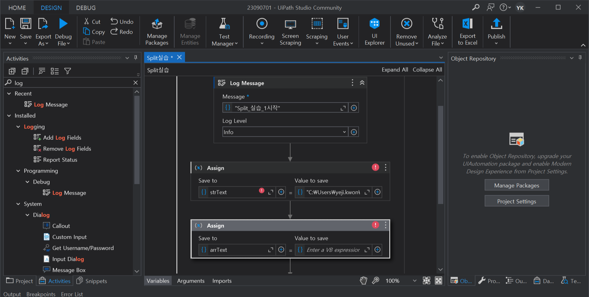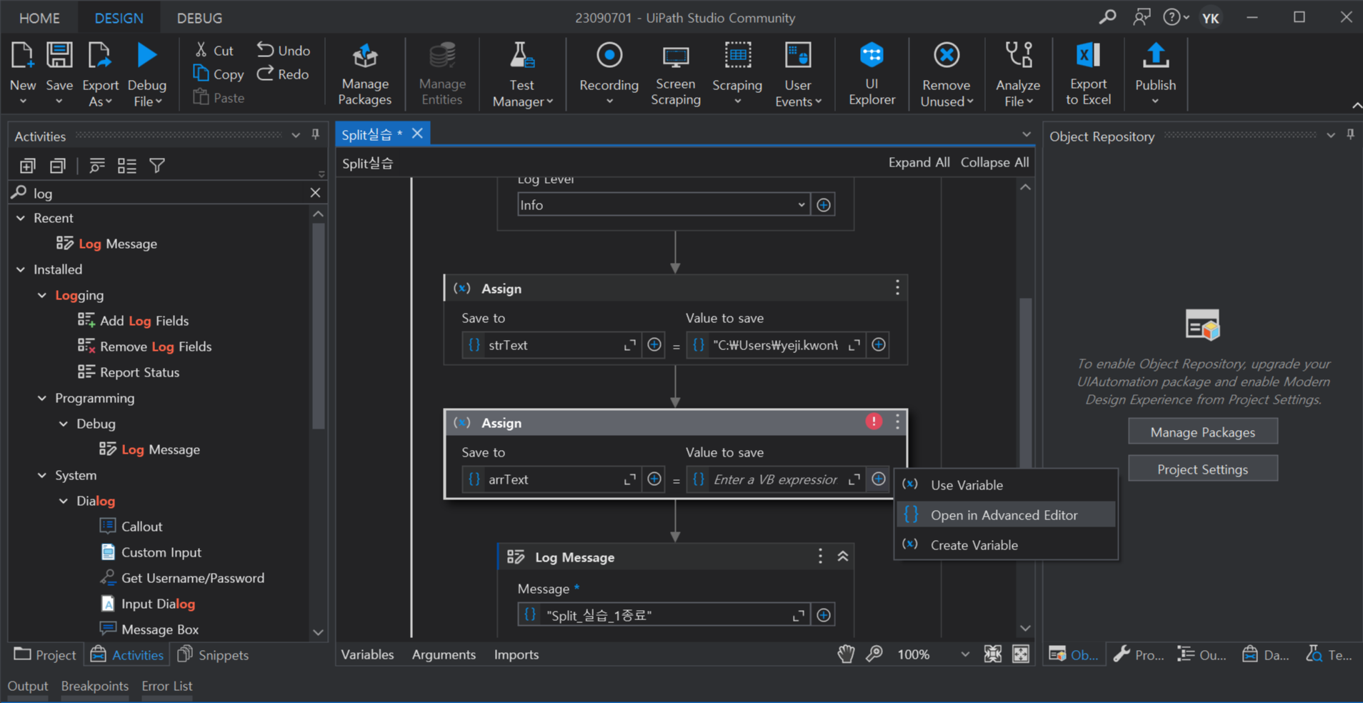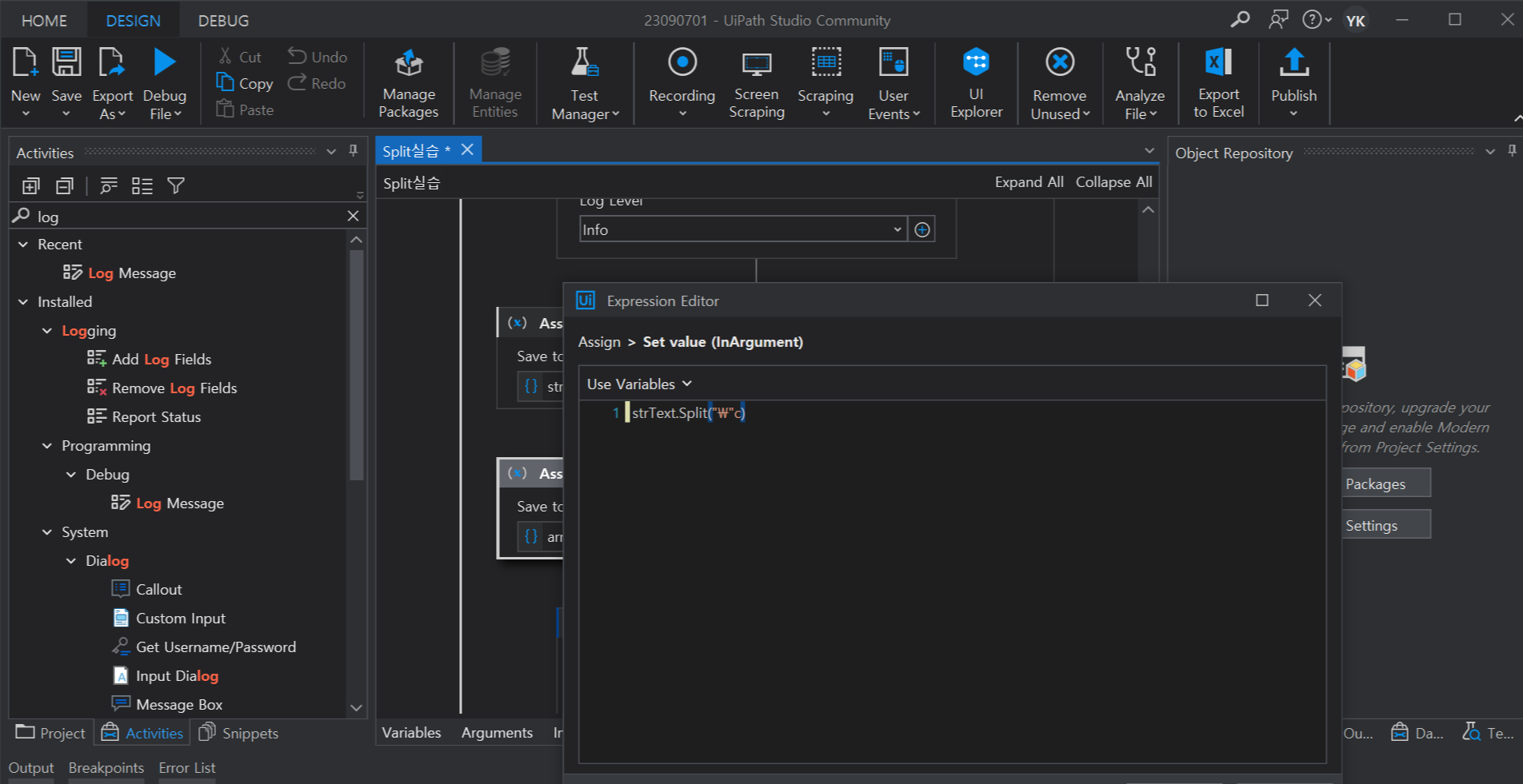 2. Log Message 시작, 종료 사이에 Assign 액티비티 추가