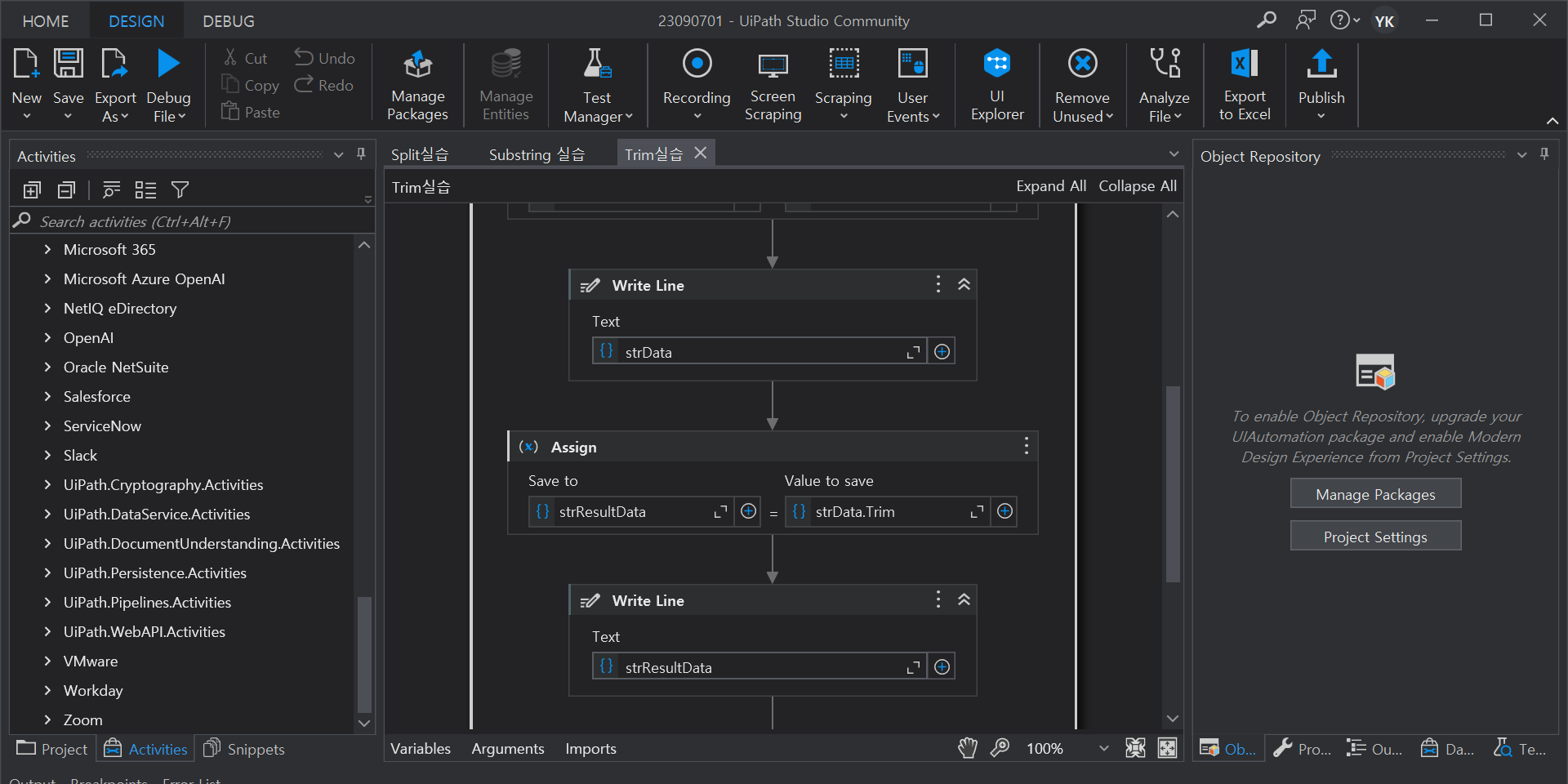 3. 각 Assign에 화면 출력 Write Line 액티비티 추가