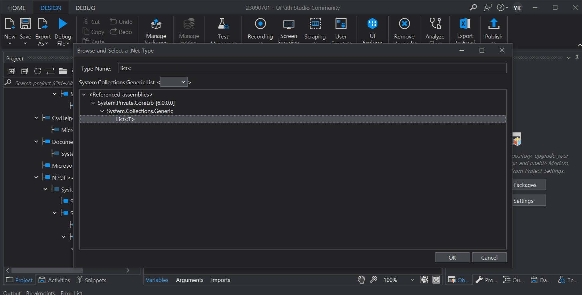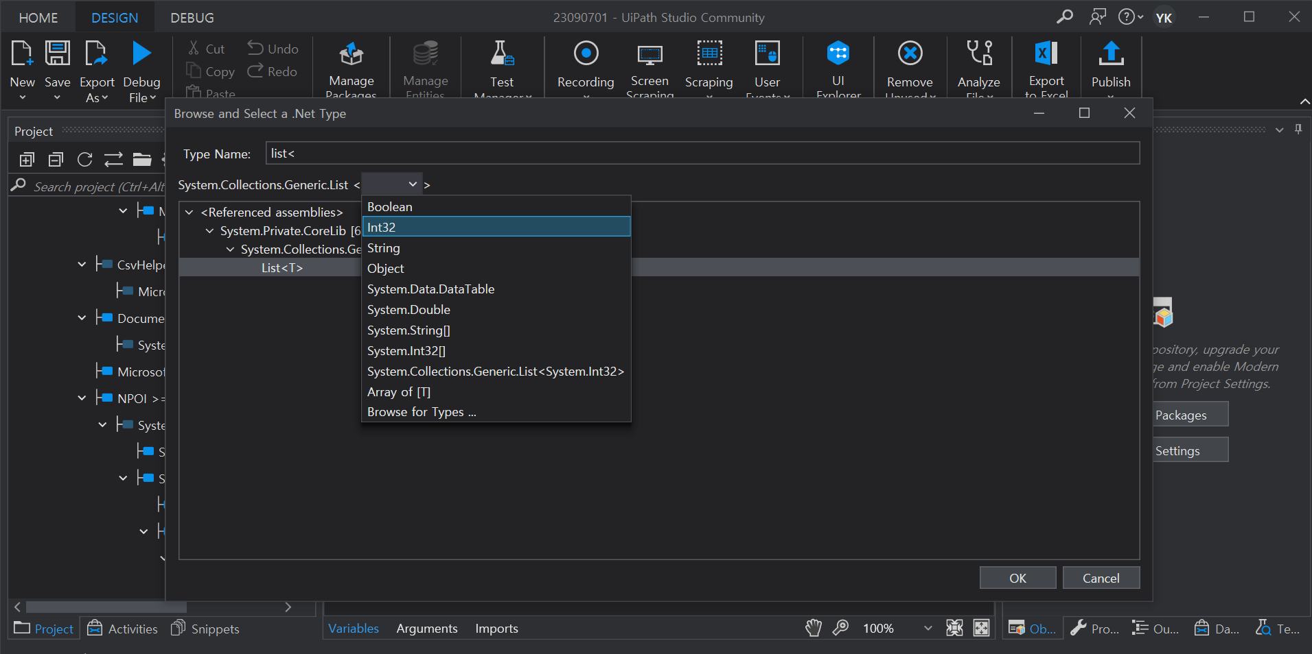 변수의 타입을 Browse for Types.. 클릭하여 List <> 선택