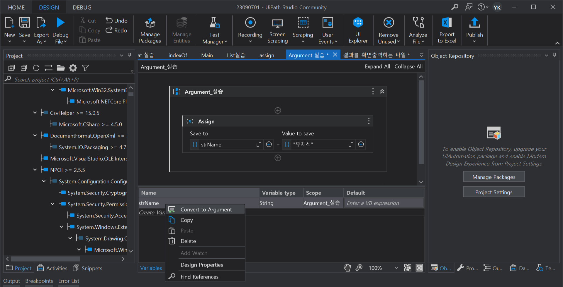 1. Assign 액티비티로 strName 변수 생성 Value to save에 "유재석" 입력