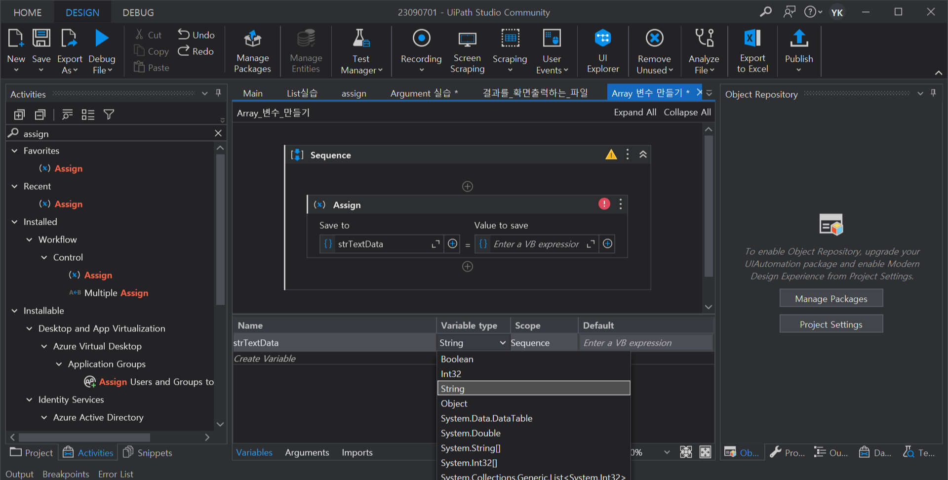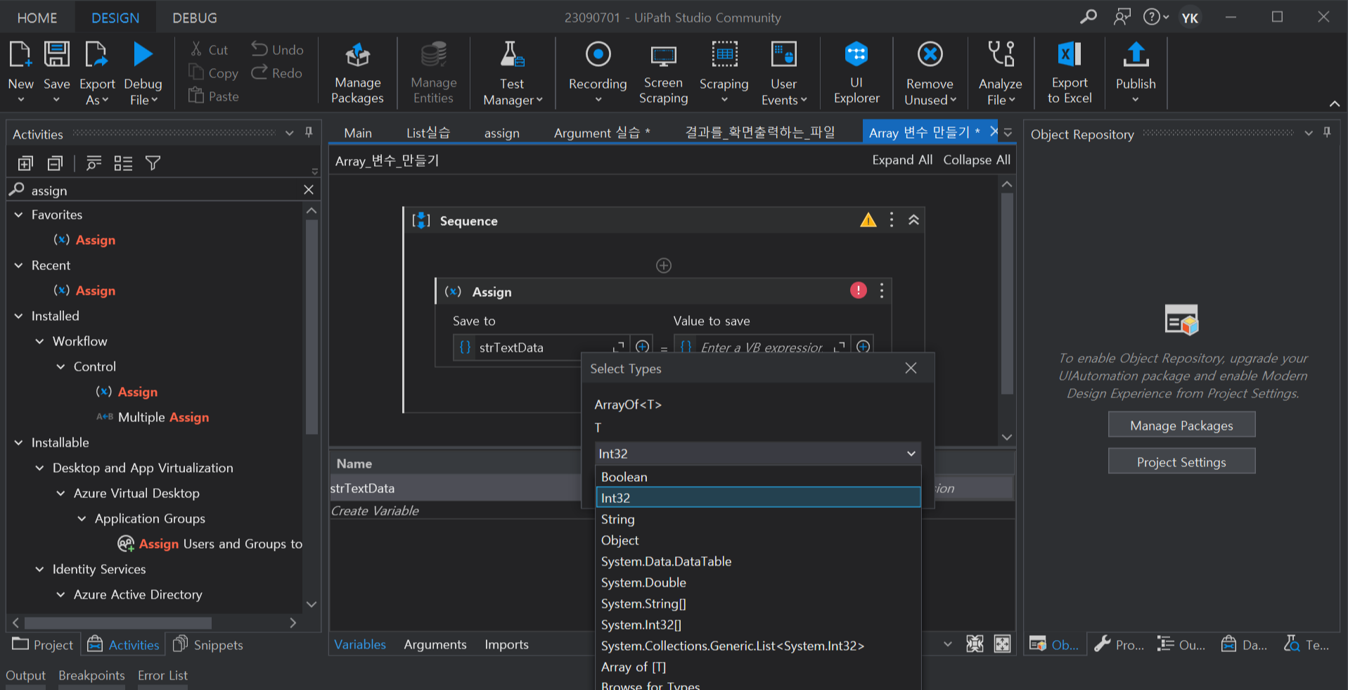 1. Activities에서 Assign 추가 후 Ctrl+K 변수 생성 후 변수 유형에서 Array of [T] 선택